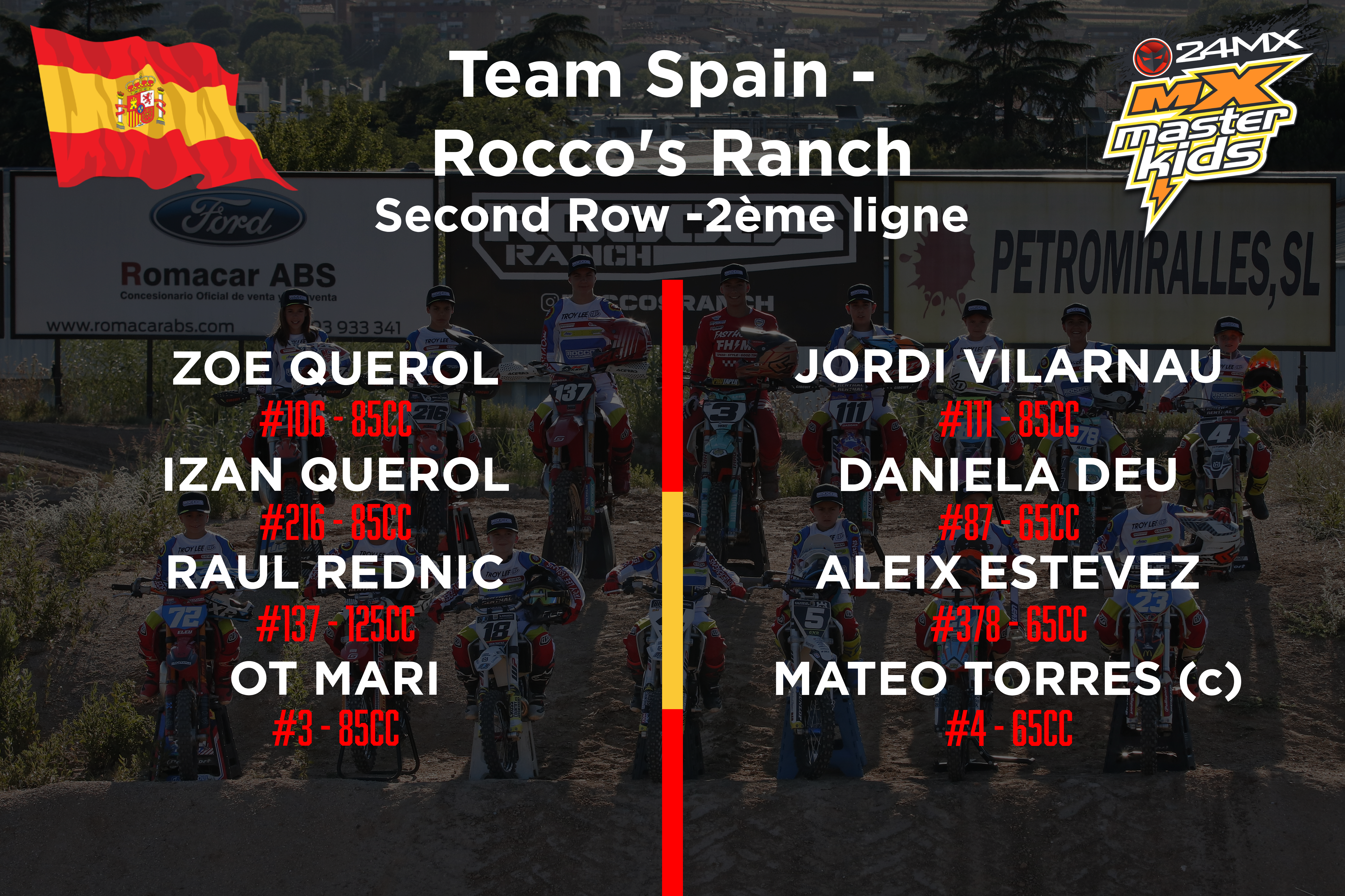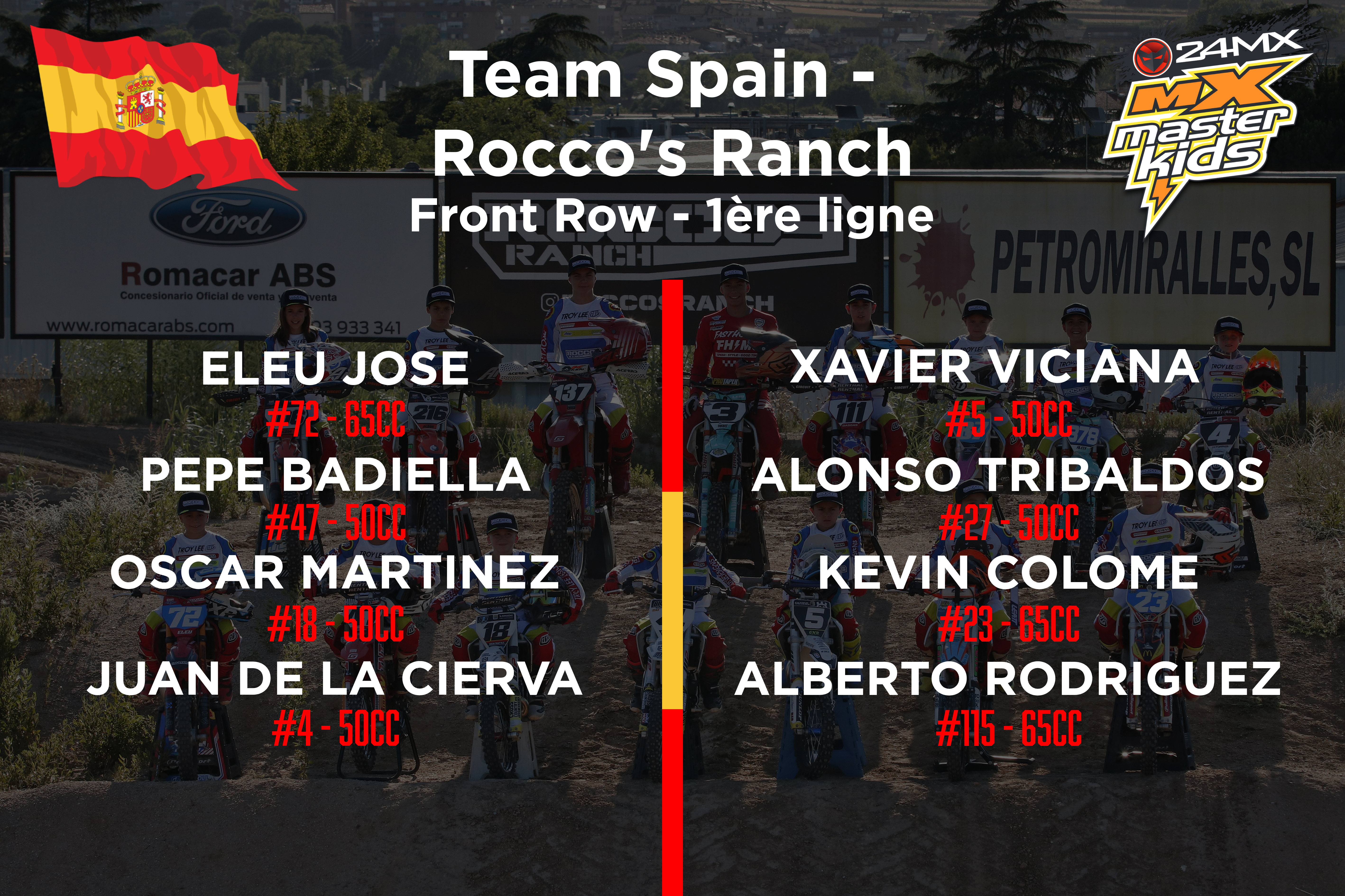 Ce samedi 25 juin, l’équipe espagnole a présenté son équipe sur le circuit Rocco’s Ranch près de Barcelone. Avec 16 pilotes, dont 2 filles, c’est une importante délégation qui sera présente au MX Masterkids les 16 et 17 juillet 2022. On les retrouvera dans toutes les jeunes catégories, notamment avec beaucoup d’espoirs en 50 et 65cc (Classe A-D)